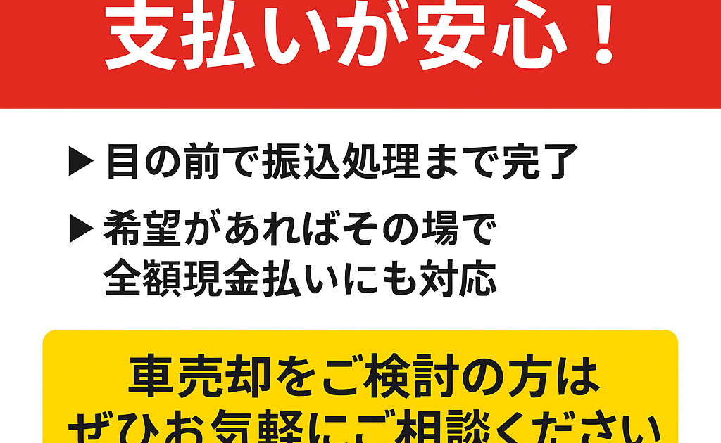 商品を買ったらその場でお金を支払うのが当たり前と同じように、 車もその場で代金を受け取るのが、お客様にとって最も安全で確実な方法です。