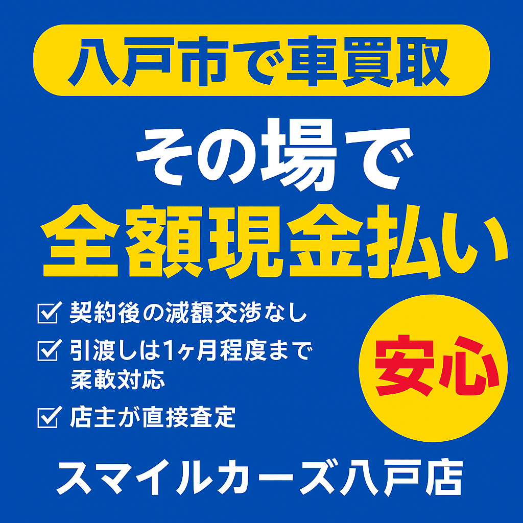 スマイルカーズ八戸店では、こうした不安を解消するために「即日現金払い」「減額交渉なし」「柔軟な引渡し対応」を徹底しています。